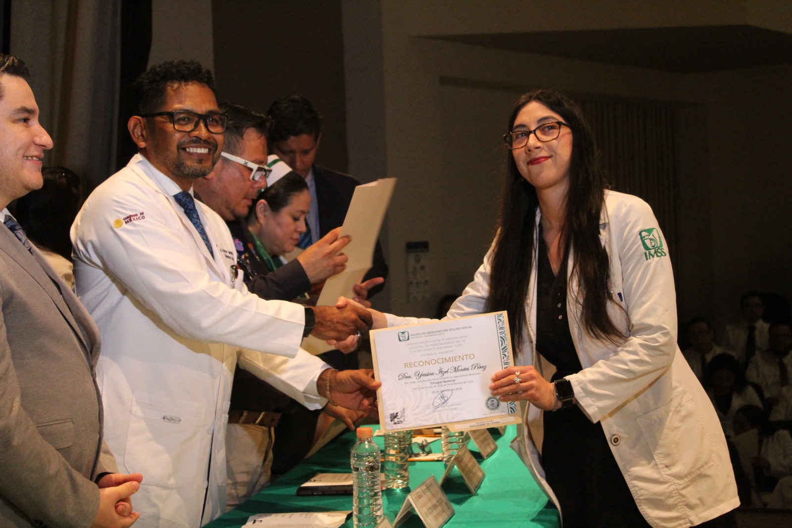 El director de UMAE, doctor Víctor Bernal Dolores, encabezó la entrega de reconocimientos para los nuevos especialistas, quienes fortalecerán la atención médica en el país en: Anestesiología, Cardiología, Cirugía General, Hematología, Imagenología diagnóstica y terapéutica, Medicina de Rehabilitación, Medicina de Urgencias, Medicina del Enfermo en estado crítico, Medicina Interna, Nefrología, Neurocirugía, Oftalmología, Otorrinolaringología y Cirugía de cabeza y cuello, Traumatología y Ortopedia y Urología.