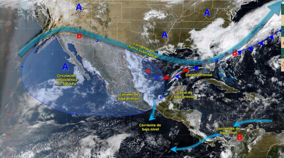 anticiclónica extendida sobre el golfo de México. Mientras tanto, los efectos de un canal de baja presión posicionado a lo largo de la vertiente oriental y e ingreso de humedad favorecerán la probabilidad para lluvias escasas o lloviznas (0.1 a 5 mm) en porciones bajas de las cuencas de norte de Veracruz, zonas montañosas del centro y en las cuencas del sur.