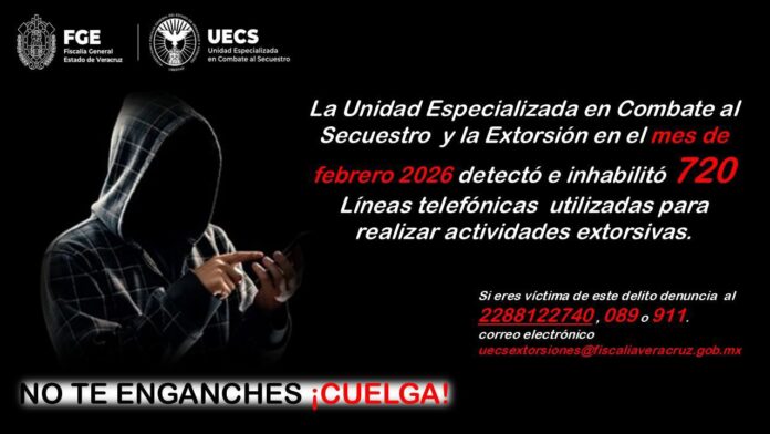 La Fiscalía General del Estado, a través de la Dirección General de la Unidad Especializada en Combate al Secuestro y la Extorsión (UECS), informa que durante febrero de 2026, fueron inhabilitadas 720 líneas telefónicas utilizadas por delincuentes para cometer extorsiones en el estado de Veracruz.