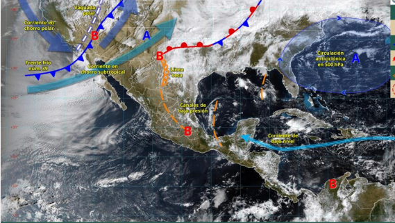 La Comisión Nacional del Agua (Conagua) informó que la persistencia de dos canales de baja presión, uno sobre el noreste y oriente del territorio nacional y el otro en el occidente y suroeste del golfo de México, junto con el flujo de humedad proveniente de ambos océanos hacia el interior del país, el calentamiento diurno, el forzamiento orográfico y condiciones locales de la región, así como la cercanía de un nuevo sistema frontal al noreste mexicano durante el domingo, provocarán nublados con probabilidad para lloviznas, chubascos (5.1 a 25 mm) y algunas tormentas fuertes (25 a 50 mm),