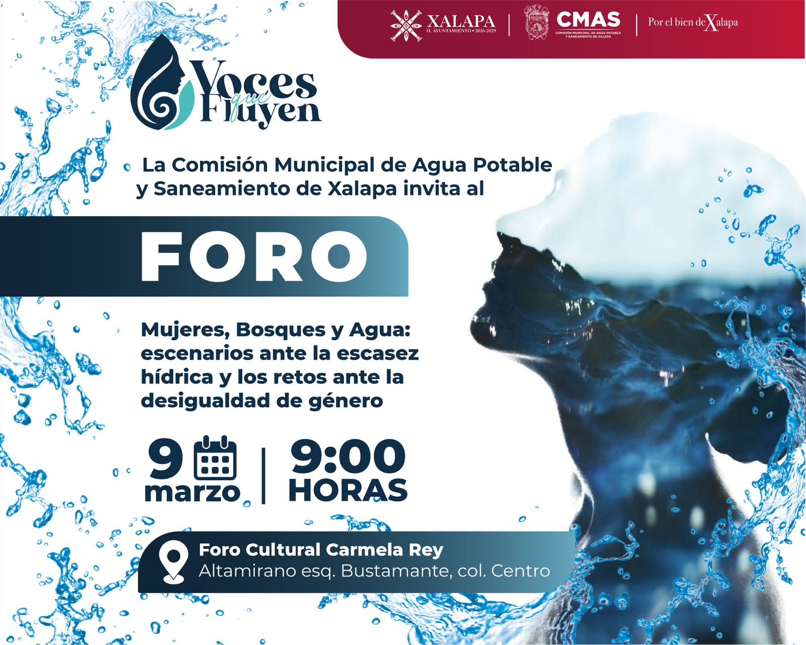 Xalapa, Ver., 7 de marzo de 2026.- Con el objetivo de abrir espacios de reflexión y diálogo sobre la relación entre el cuidado del agua, los ecosistemas forestales y la equidad de género, la Comisión Municipal de Agua Potable y Saneamiento (CMAS) realizará la Primera Jornada “Agua, Bosques y Género: Voces que Fluyen”.