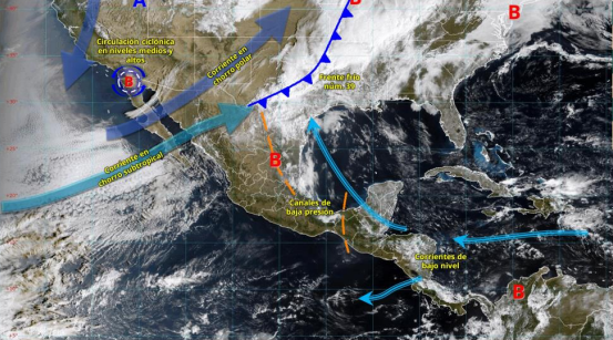 Sobre la entidad veracruzana los efectos de una canal de baja presión que se posicionará sobre el sureste del golfo de México durante el domingo, el cual se moverá hacia la vertiente oriental a partir del lunes, además del ingreso de humedad y el calentamiento diurno mantendrán el potencial para lloviznas, lluvias y chubascos (5.1 a 25 mm) en zonas montañosas desde la cuenca del río Cazones hasta el Papaloapan.