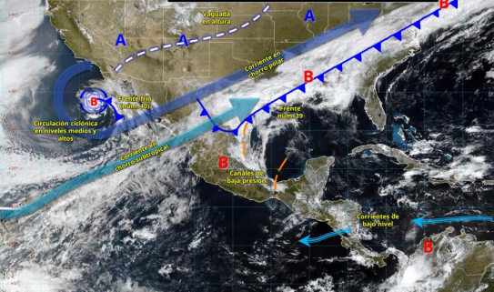 La Comisión Nacional del Agua (Conagua) informó que el sistema frontal No. 39 tenderá a disiparse en el noreste del país, manteniéndose el domino de la circulación anticiclónica en el Golfo de México y ocasionando la interacción del ingreso de humedad hacia la vertiente oriental del país con condiciones locales y el canal de baja presión en el suroeste del mismo Golfo.