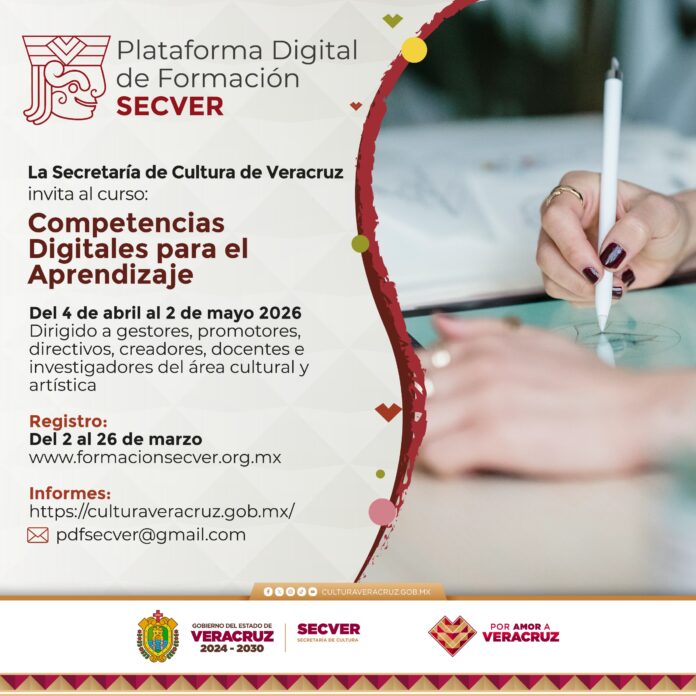 Xalapa, Ver., lunes 09 de marzo de 2026.- La Secretaría de Cultura de Veracruz (SECVER) invita a participar en el curso virtual Competencias Digitales para el Aprendizaje 2026, que estará disponible del 04 de abril al 02 de mayo en la plataforma https://www.formacionsecver.org.mx/, con inscripción previa.