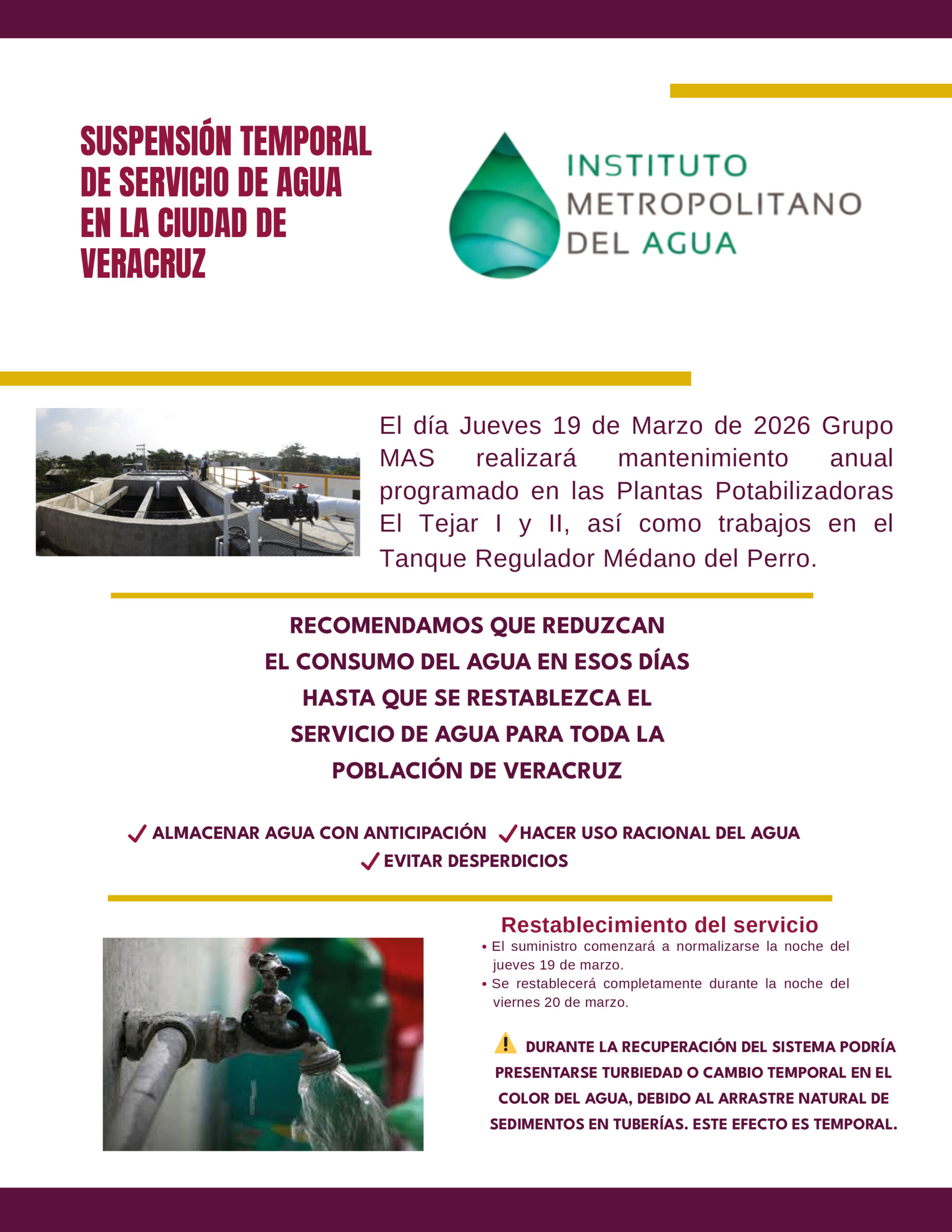Debido al mantenimiento preventivo anual en las plantas potabilizadoras El Tejar I y II y en el tanque regulador Médano del Perro, el Instituto Metropolitano del Agua (IMA) exhorta a la ciudadanía a tomar previsiones ante la suspensión temporal del servicio de agua potable en toda la ciudad de Veracruz, el próximo jueves 19 de marzo, por lo que recomienda almacenar agua con anticipación y hacer un uso racional del vital líquido.