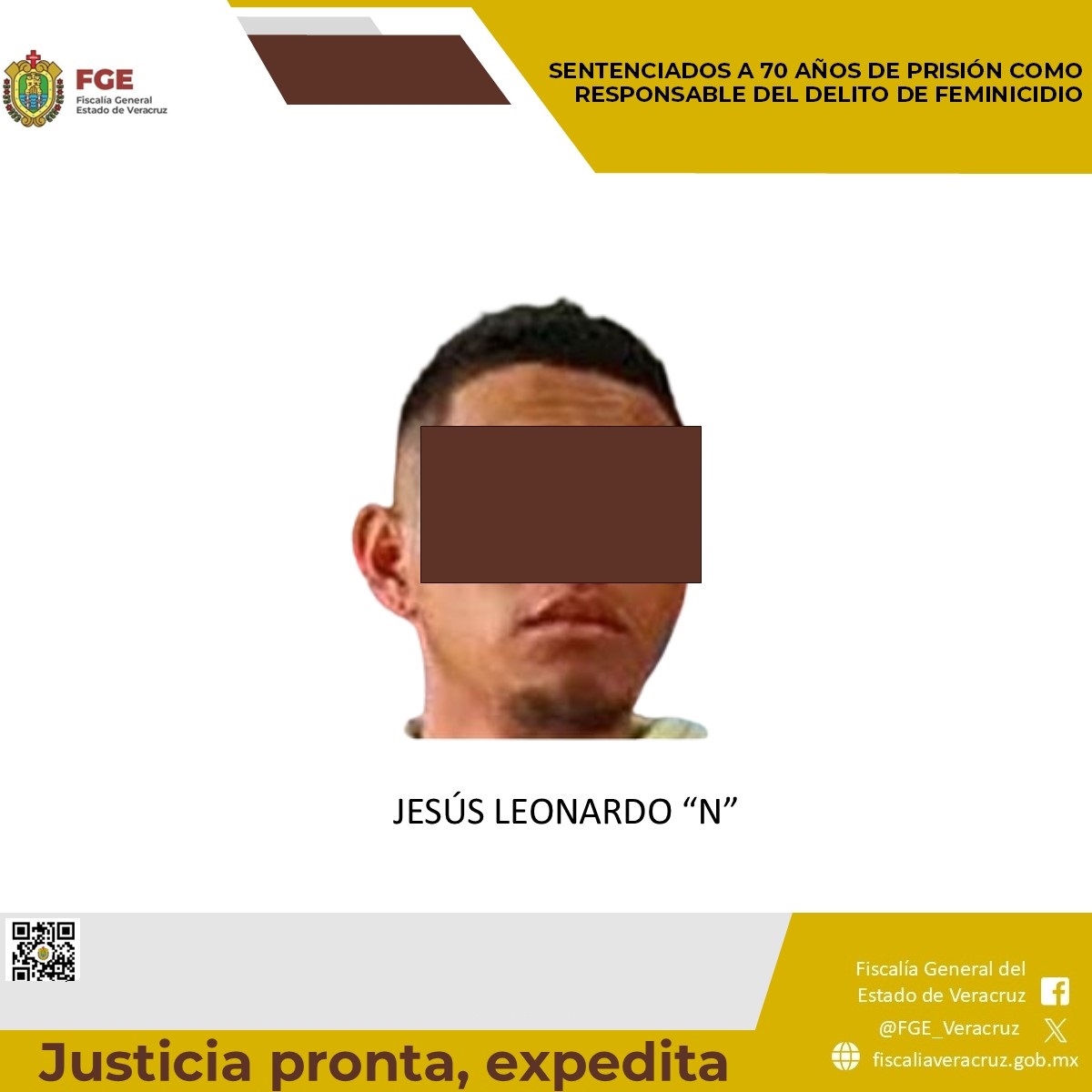 Xalapa, Ver., 23 de marzo de 2026.- Como resultado de una investigación ministerial sólida y el desahogo de pruebas en el juicio oral, la Fiscalía General del Estado de Veracruz, a través de la Fiscalía Coordinadora Especializada en Delitos contra las Mujeres, Feminicidio, Familia y Trata de Personas, logró una sentencia condenatoria de 70 años de prisión en contra de Jesús Leonardo “N”, declarado por el órgano jurisdiccional responsable del delito de feminicidio, en agravio de su concubina.