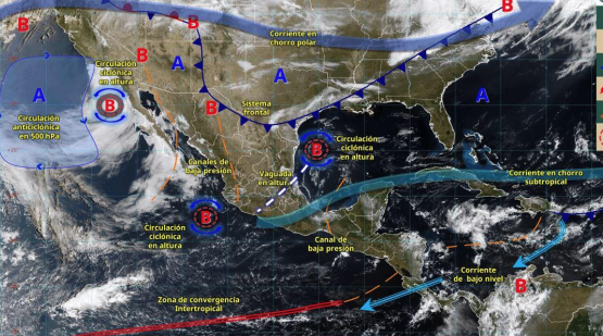 La Comisión Nacional del Agua (Conagua) informó que se mantendrá el dominio de la circulación anticiclónica en el Golfo de México, favoreciendo el ingreso de humedad hacia Tamaulipas y Veracruz, así como su interacción con el calentamiento diurno, forzamiento orográfico y la presencia del canal de baja presión en el suroeste del mismo Golfo; favoreciendo el incremento de nubosidad y la presencia de nieblas, neblinas y lluvias acompañadas de actividad eléctrica, viento en rachas y la probabilidad de caída de granizo, presentándose vespertinas a nocturnas en zonas montañosas y nocturnas a matutinas