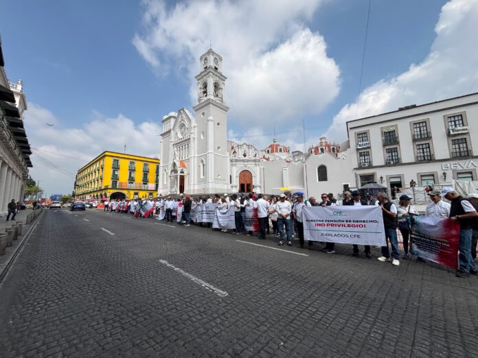 Jubilados de confianza de la Comisión Federal de Electricidad (CFE) marcharon en la zona centro de la ciudad de Xalapa, donde repudiaron el recorte del 50 por ciento en sus percepciones económicas.