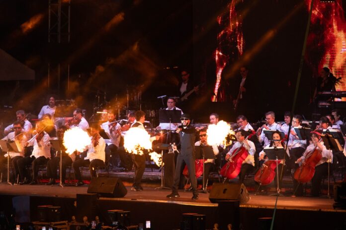 Ante un recinto completamente lleno, el artista compartió el escenario con la Orquesta Sinfónica del Gobierno del Estado de Veracruz dirigida por Cristian Texon, transformando la noche en un viaje musical que combinó arreglos orquestales, luces y una atmósfera vibrante, elevando el reguetón a un formato de gala sin perder la esencia del ‘perreo’.