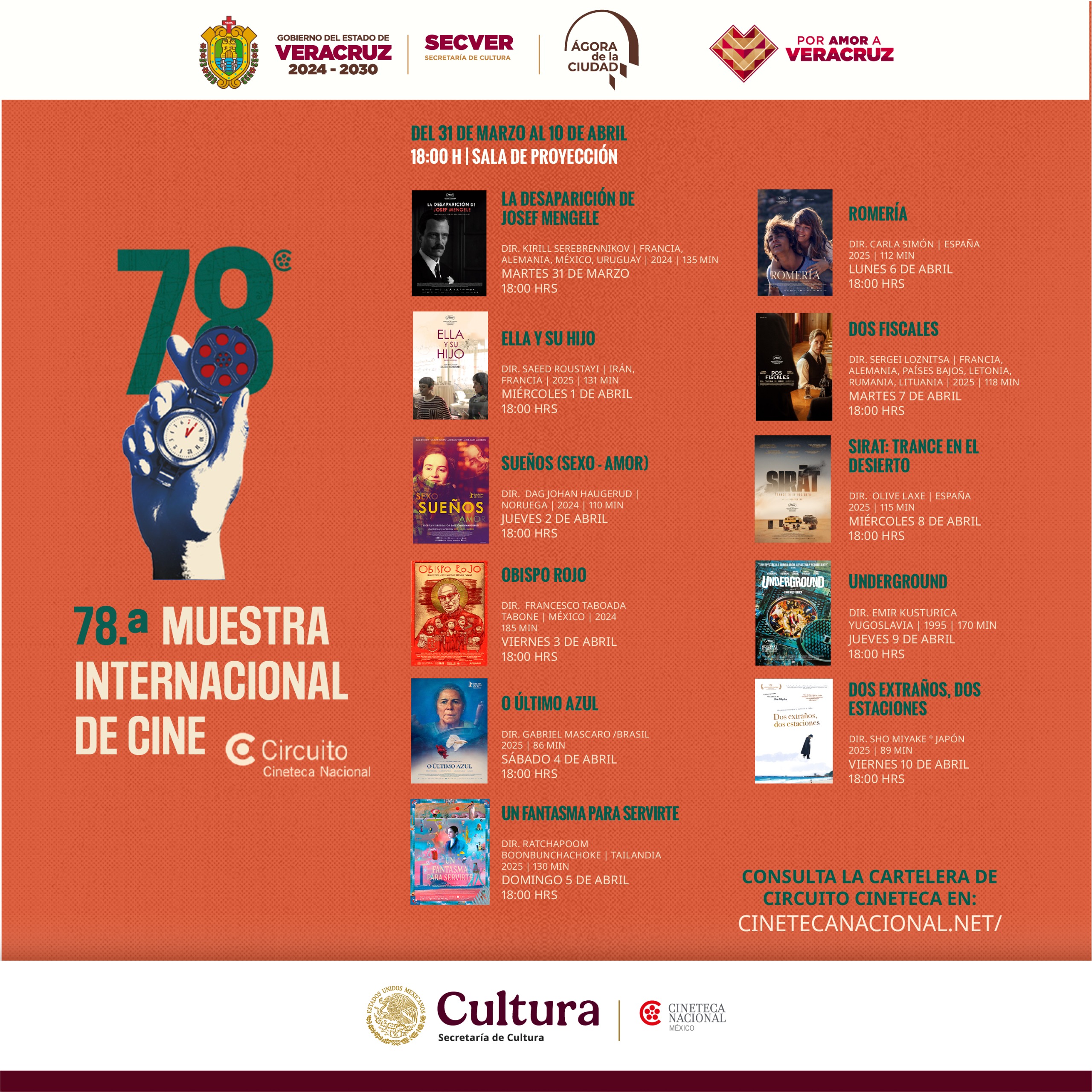 Xalapa, Ver., martes 31 de marzo de 2026.- La Secretaría de Cultura de Veracruz (SECVER) invita a la 78.ª Muestra Internacional de Cine de la Cineteca Nacional, que inicia hoy 31 de marzo y concluirá el 10 de abril en el Ágora de la Ciudad, a las 17:00 horas. La entrada es libre.