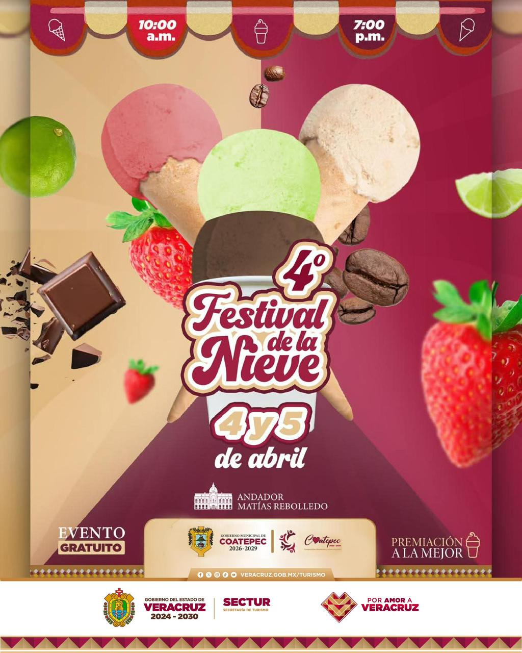 Xalapa, Ver., miércoles 01 de abril de 2026.– Esta Semana Santa, la Secretaría de Turismo invita a disfrutar de actividades recreativas en el Pueblo Mágico de Coatepec, como la Feria de la Nieve, que se llevará a cabo los días 04 y 05 de abril en el andador Matías Rebolledo, de 10:00 a 19:00 horas, con entrada gratuita.