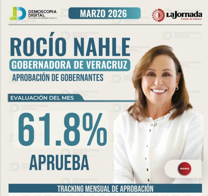 La gobernadora de Veracruz, Rocío Nahle García, registra 61.8 por ciento de aprobación ciudadana, de acuerdo con la medición nacional de marzo de 2026 de Demoscopía Digital, posicionándose entre las gobernadoras mejor evaluadas del país.