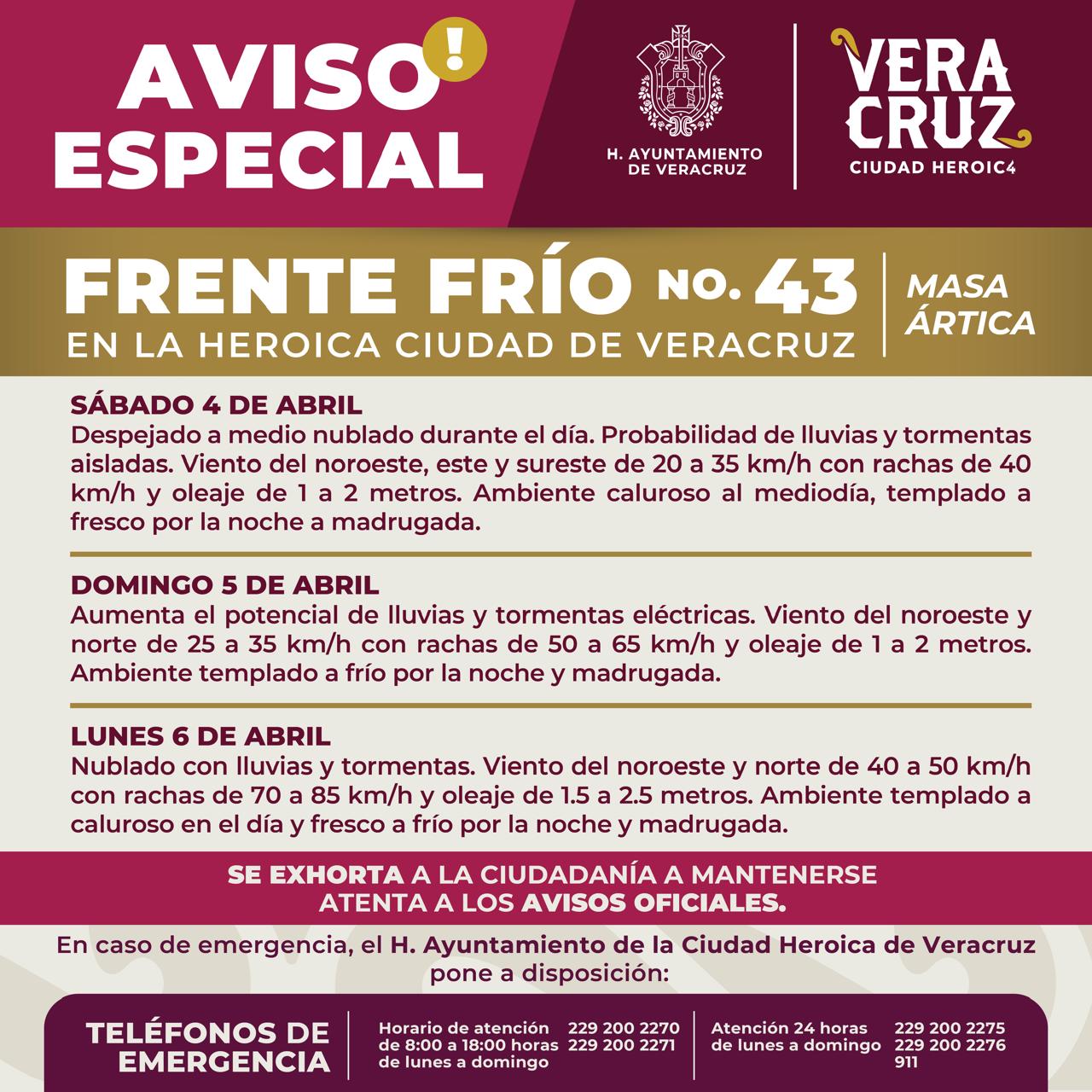 La dirección de Protección Civil Municipal de Veracruz informa a la población que a partir de este domingo 5 de abril, el Frente Frío 43 ingresará a la ciudad con viento intenso, lluvias y aumento del oleaje, por lo que se exhorta a tomar precauciones para evitar riesgos en su integridad física y la de sus familias.