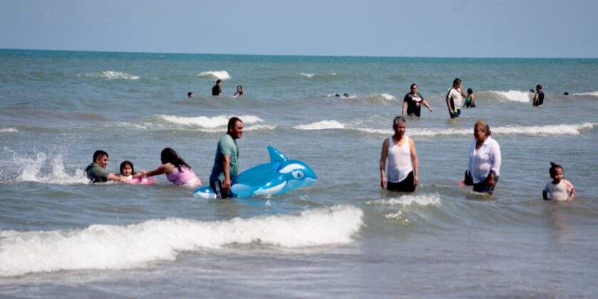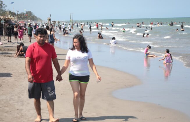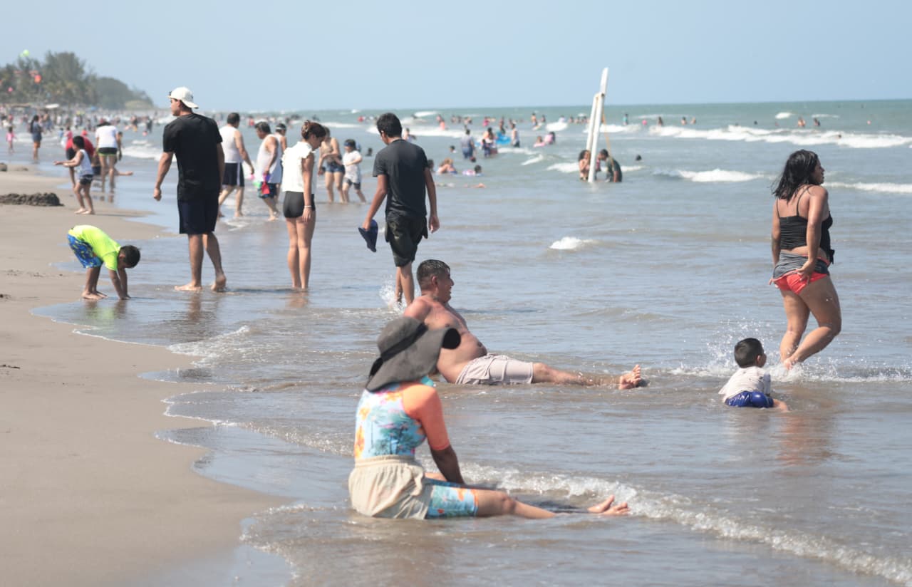 Desde las primeras horas del día se observa la llegada de grupos familiares, que comparten alimentos, practican actividades recreativas como voleibol y disfrutan del mar en un ambiente ordenado y seguro.