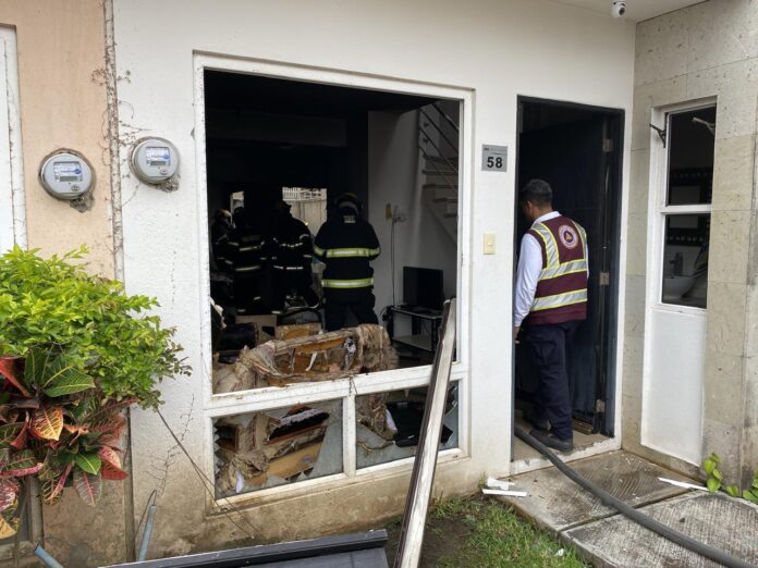 Elementos de Bomberos y de la Dirección de Protección Civil Municipal de Veracruz atendieron un incendio en una vivienda del fraccionamiento Dream Lagoons, presuntamente originado por una explosión derivada de acumulación de gas en las instalaciones domésticas.