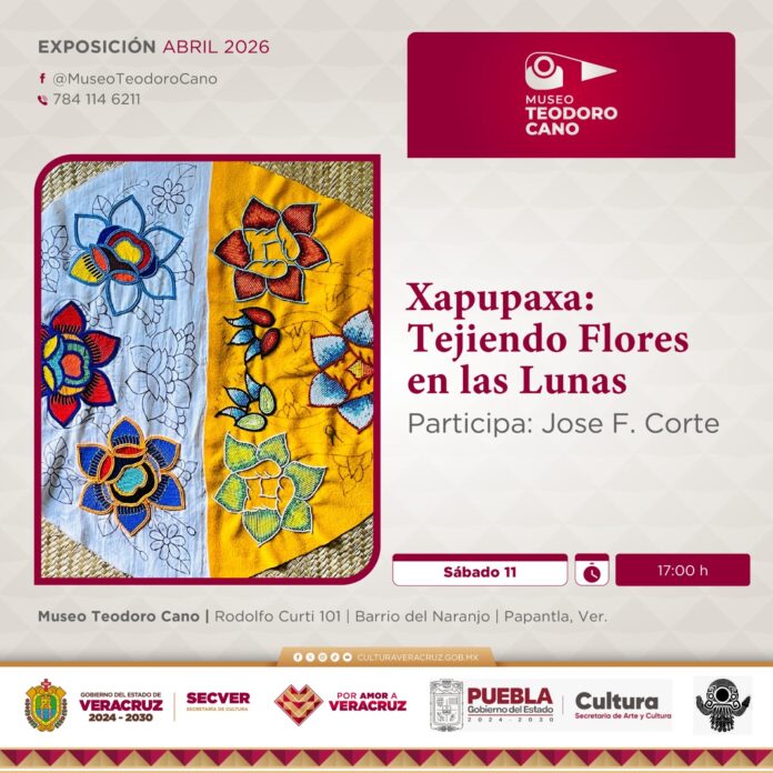 Xalapa, Ver., jueves 09 de abril de 2026.- La Secretaría de Cultura de Veracruz (SECVER) invita a la inauguración de la exposición Xapupaxa: Tejiendo flores en las lunas, del artista José F. Corte, el sábado 11 de abril a las 17:00 horas en el Auditorio del Museo Teodoro Cano, en Papantla. La entrada es gratuita.