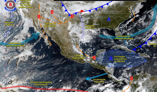 La Comisión Nacional del Agua (Conagua) informó que los efectos de un canal de baja presión que se extenderá a lo largo del centro del territorio nacional, el ingreso de humedad y los efectos orográficos, además de los efectos de una vaguada en la atmósfera superior que cruzará de oeste a este sobre el centro y noreste del país durante el domingo favorecerán el desarrollo de nublados con probabilidad para lluvias en la región.
