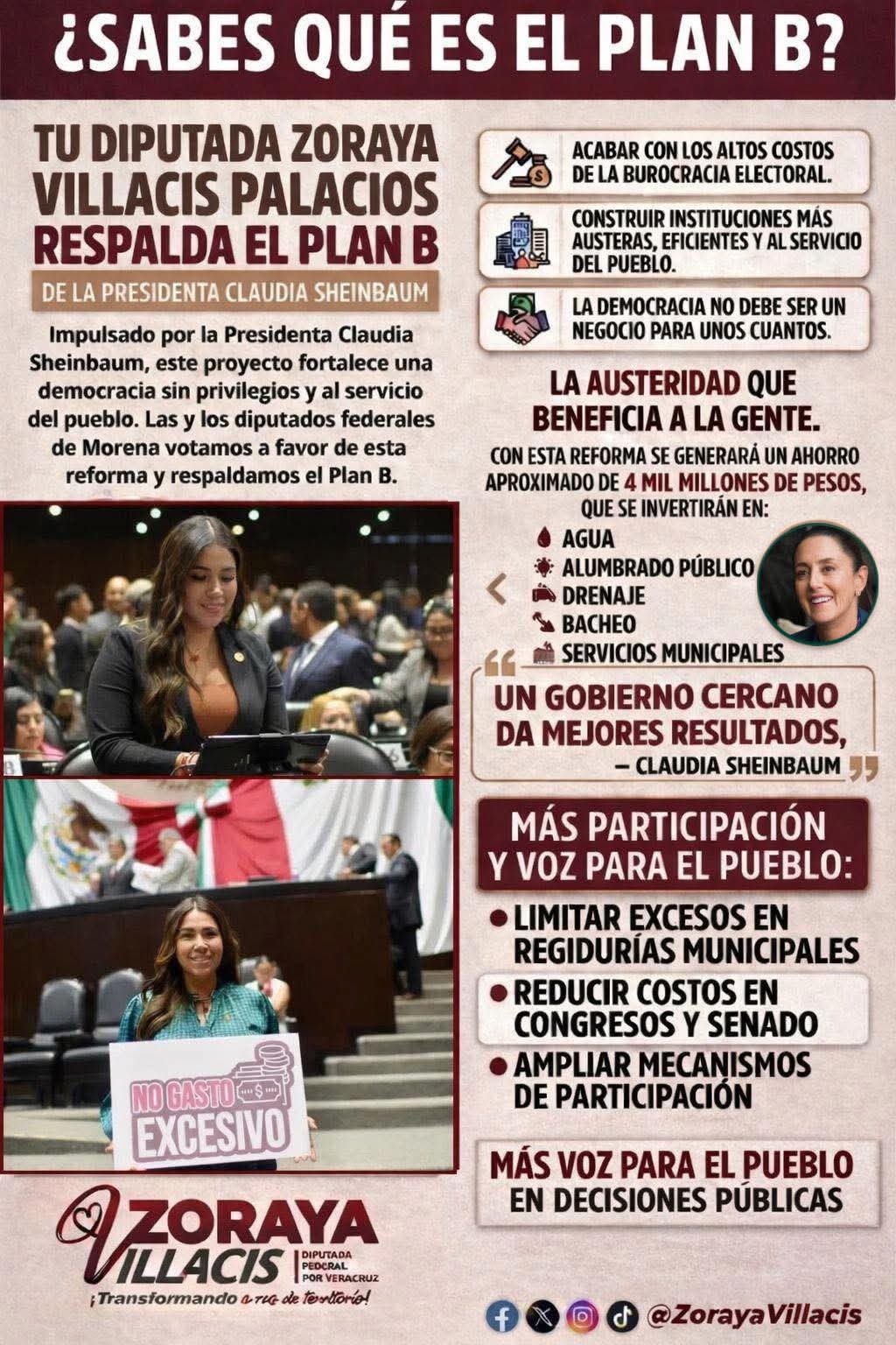 Ciudad de México.— Tras la aprobación del denominado “Plan B” de la Reforma Electoral, la diputada federal por Veracruz, Zoraya Villacis Palacios, manifestó su respaldo a la iniciativa impulsada por la presidenta Claudia Sheinbaum, al considerar que fortalece una democracia “sin privilegios y al servicio del pueblo”.