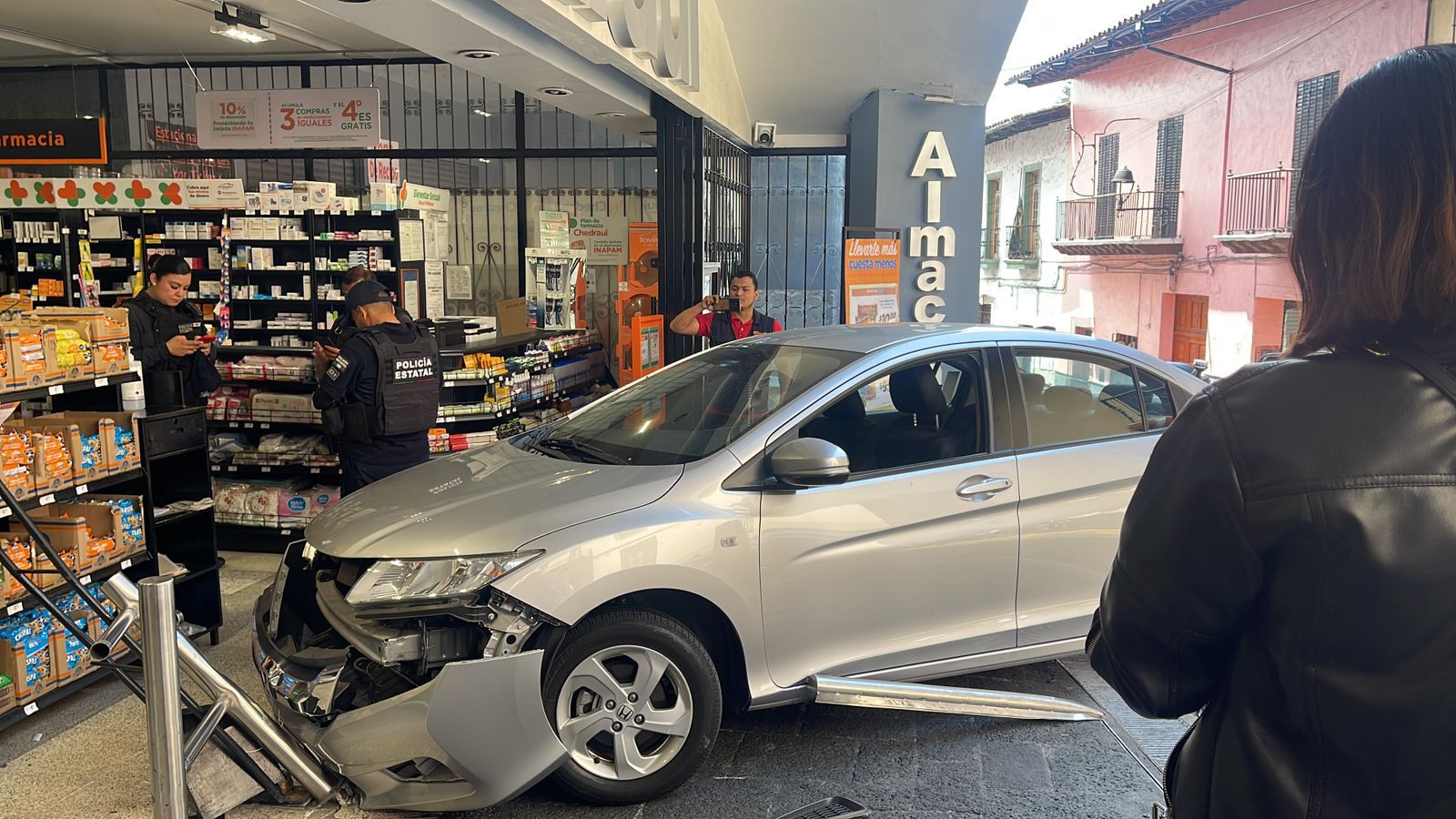 Según los reportes preliminares, el automóvil involucrado, un Honda City color blanco con placas de circulación YJR-031-A, terminó con la parte frontal dentro del establecimiento tras romper los cristales de acceso y superar las protecciones perimetrales, ante la sorpresa de empleados y clientes que se encontraban realizando sus compras en ese momento.