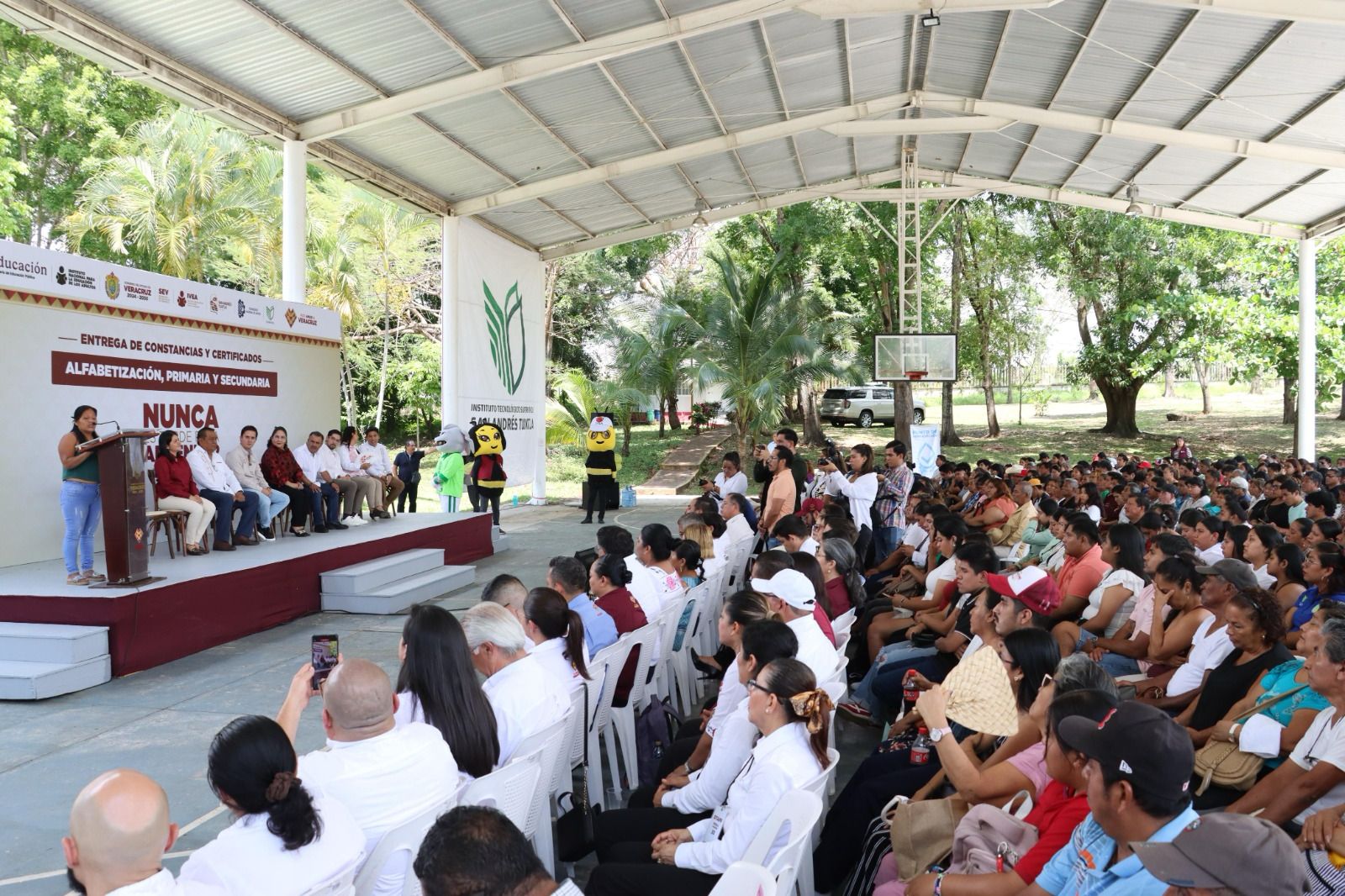 San Andrés Tuxtla, Ver., jueves 16 de abril de 2026.- Como parte de las acciones para reducir el rezago educativo, la Secretaría de Educación de Veracruz (SEV) entregó 414 constancias de alfabetización, así como 10 certificados de primaria y 10 de secundaria a personas mayores de 15 años que concluyeron su educación básica.