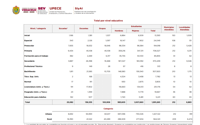 La Secretaría de Educación de Veracruz (SEV) presentó la actualización de su Prontuario Estadístico, referente al ciclo escolar 2025-2026 y el cual contiene datos por demás relevantes para la toma de decisiones en los años venideros. Le cito algunos ejemplos de las estadísticas.