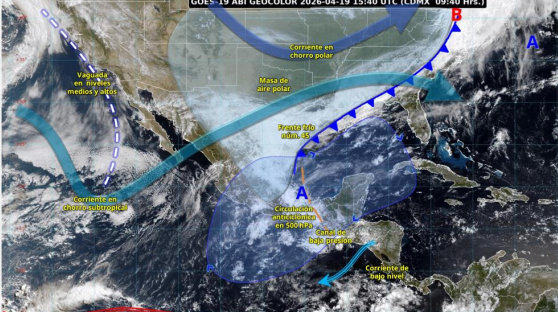 La Comisión Nacional del Agua (Conagua) informó que el frente frío No. 45 estacionario en el centro del Golfo de México y masa de aire frío que se le asocia cubriendo la vertiente oriental del país y canal de baja presión en el suroeste del mismo Golfo; dicha masa de aire frío modificará sus características térmicas gradualmente a partir de la tarde del lunes; restableciéndose la circulación anticiclónica en el mismo Golfo a partir del martes.