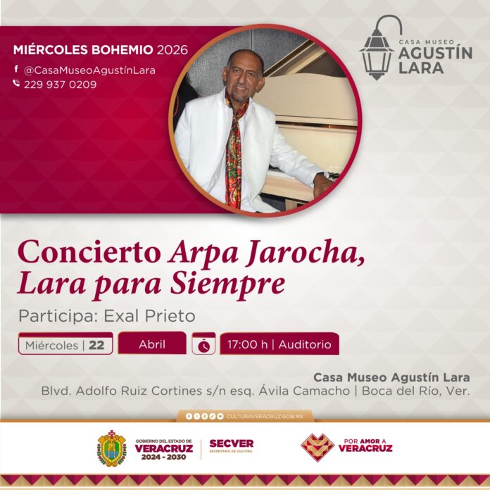 Xalapa, Ver., martes 21 de abril de 2026.- La Secretaría de Cultura de Veracruz (SECVER) invita al recital Arpa jarocha, Lara para siempre, el próximo miércoles 22 a las 17:00 horas, en el Auditorio de la Casa Museo Agustín Lara, en Boca del Río. La entrada es gratuita.