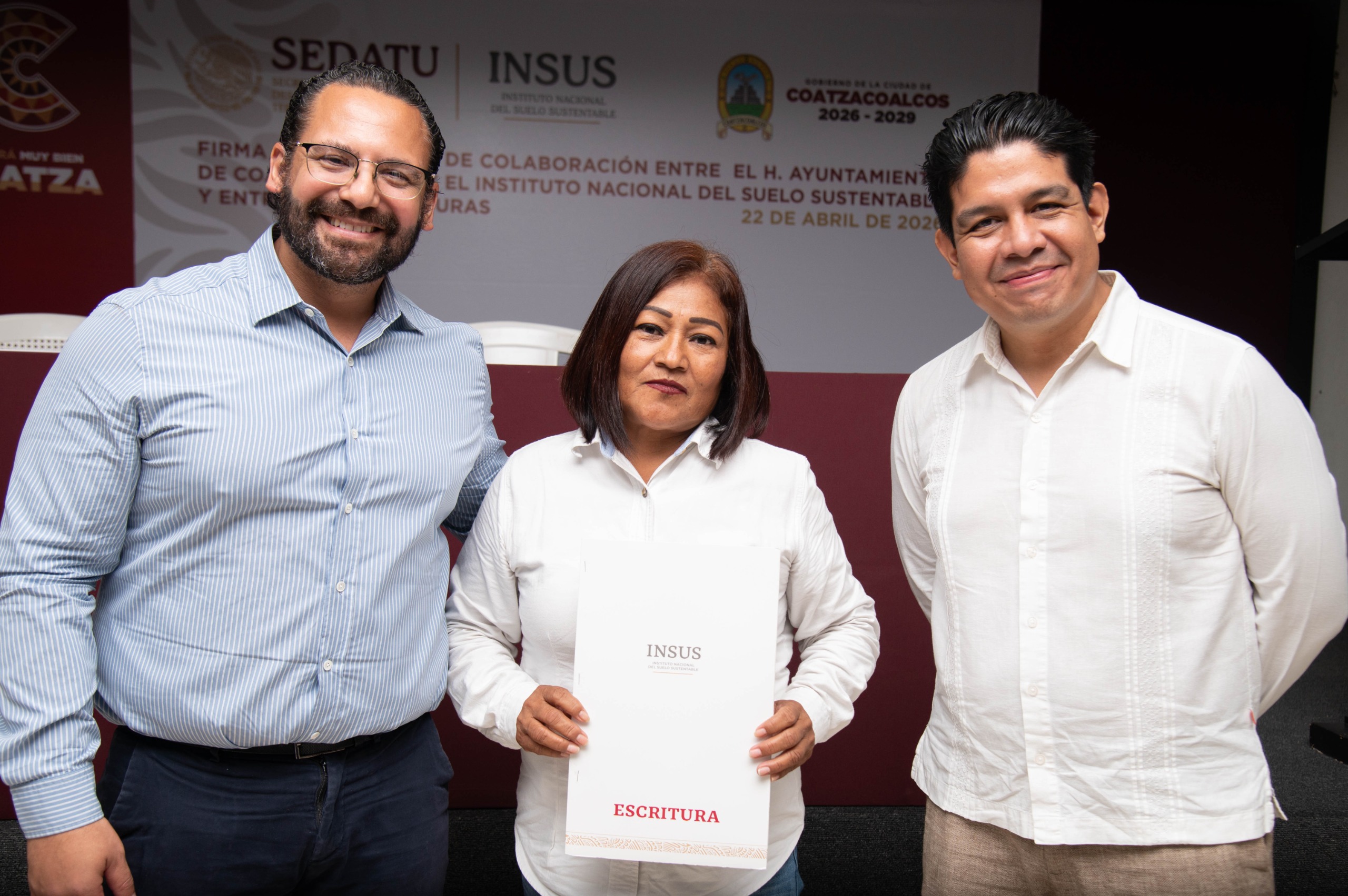 Coatzacoalcos, Ver., 22 de abril de 2026.- Un total de 31 familias de Coatzacoalcos y Villa Allende recibieron sus escrituras, algunas tras más de dos décadas de espera, como parte de una estrategia de regularización impulsada por el Gobierno Municipal en coordinación con el Instituto Nacional del Suelo Sustentable (INSUS) que incluyó la firma de colaboración entre ambas dependencias.
