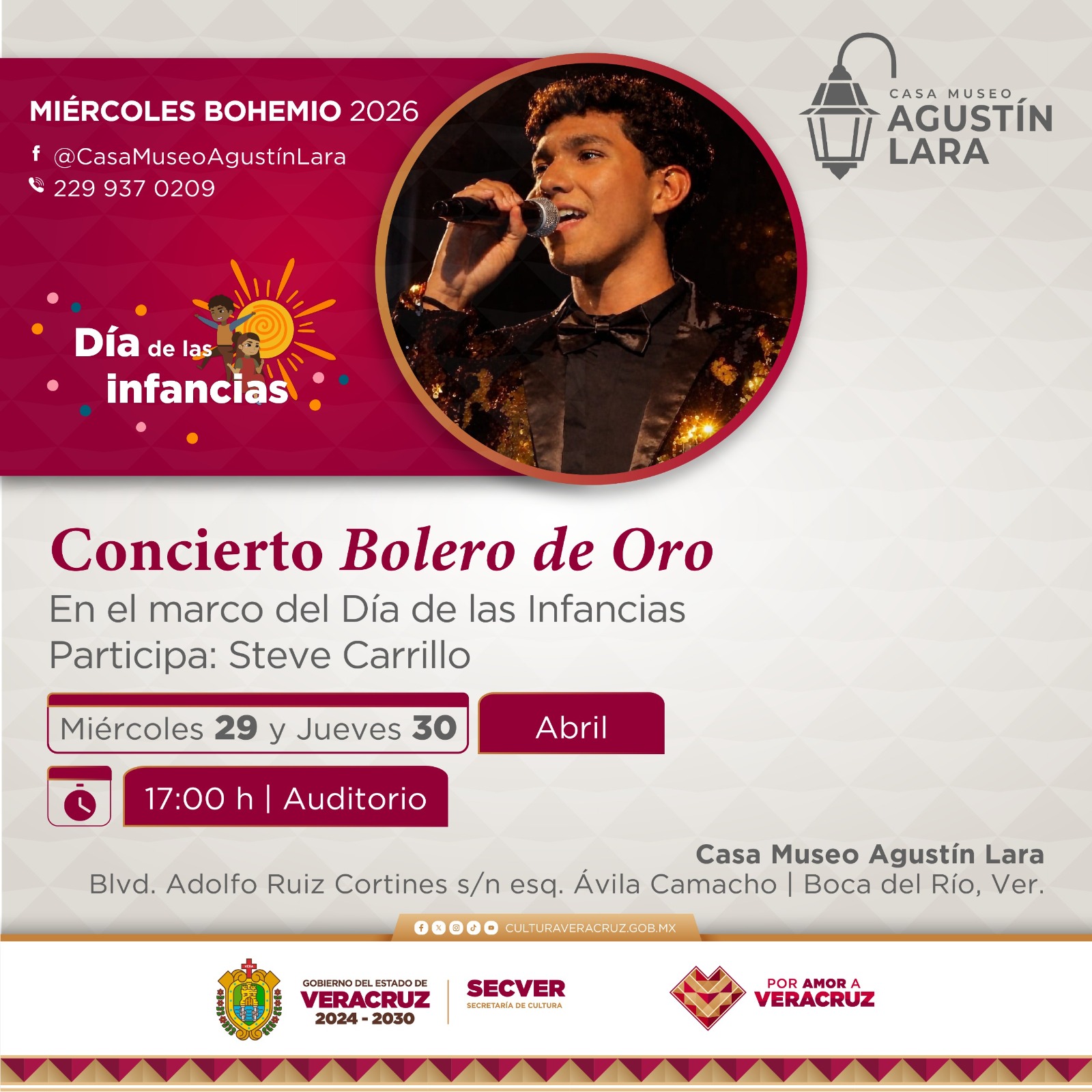 Xalapa. Ver., lunes 27 de abril de 2026.- La Secretaría de Cultura de Veracruz (SECVER) invita al concierto Bolero de Oro, que se realizará los días 29 y 30 de abril, a las 17:00 horas, en el auditorio de la Casa Museo Agustín Lara, en Boca del Río, en el marco del Día de las Infancias. La entrada es gratuita.