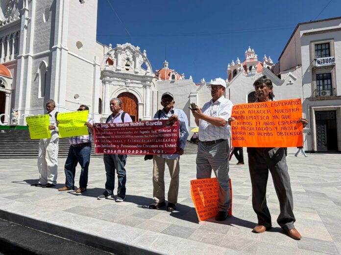 Un grupo de jubilados y pensionados del Ingenio San Gabriel, ubicado en Cosamaloapan, se manifestó en Plaza Lerdo para denunciar un rezago de casi dos décadas en el pago de sus prestaciones laborales.